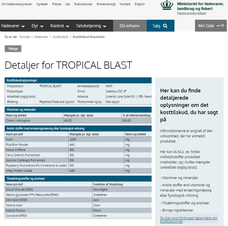 Tropical Blast er anmeldt ved den Danske Fødevarestyrelse